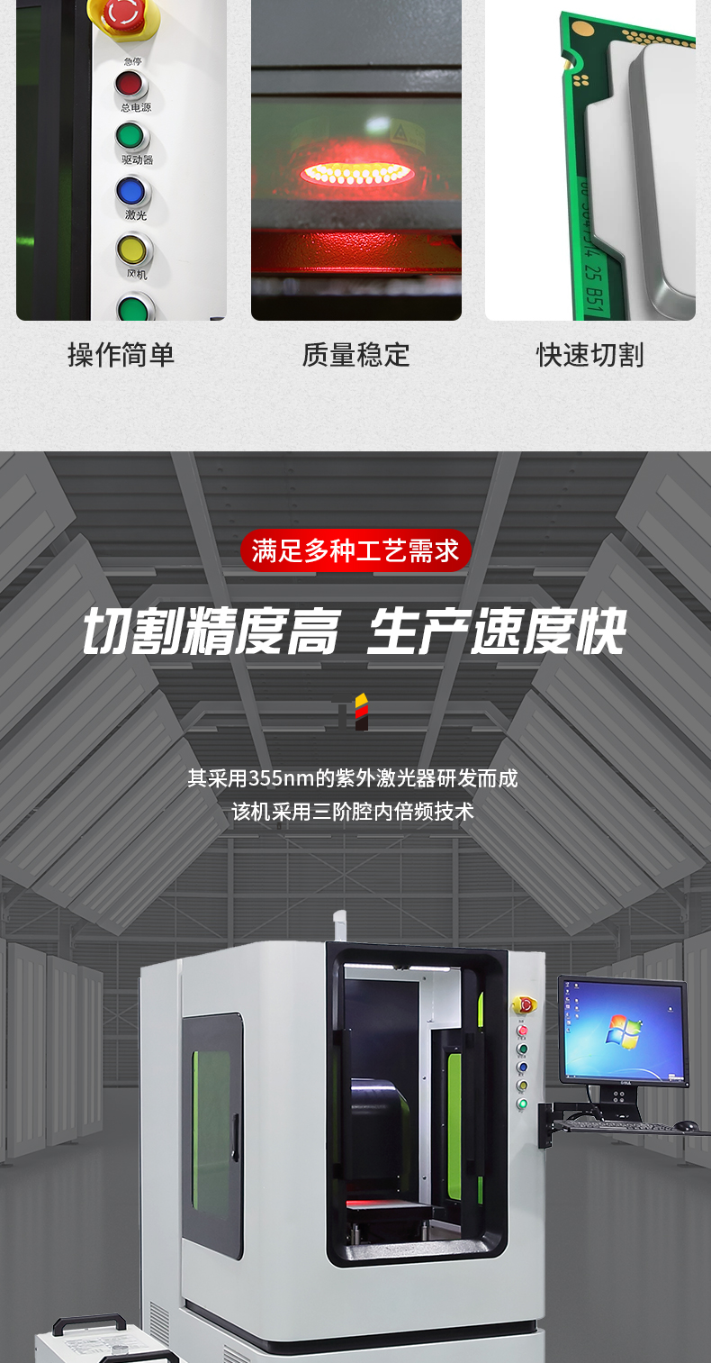 紫外激光切割機屬于激光切割機的系列產品,其采用355nm的紫外激光器研發(fā)而成,該機采用三階腔內倍頻技術,同紅外激光比較,355紫外光聚焦光斑極小,能在很大程度上降低材料的機械變形且加工熱影響小,因為主要用于超精細切割、雕刻,特別適合用于食品、醫(yī)藥包裝材料打標、打微孔、玻璃材料的高速劃分及對硅片晶圓進行復雜的圖形切割等應用領域。